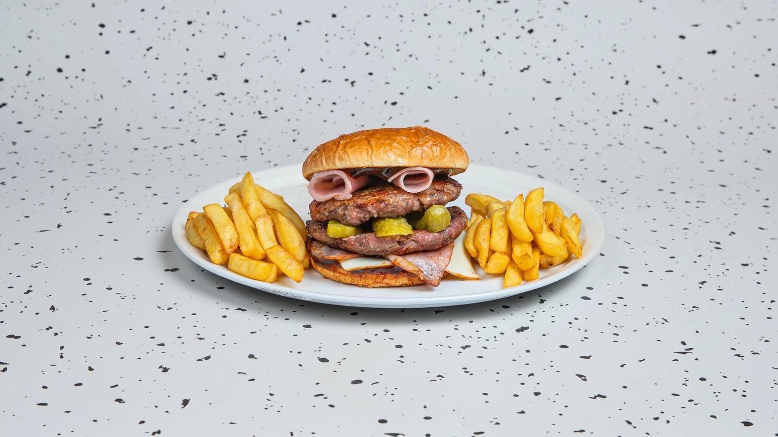 Με διπλό μπιφτέκι από μοσχαρίσιο & χοιρινό κιμά, μπέικον, πάριζα, gouda & σως BBQ. Συνοδεύεται από πατάτες τηγανητές